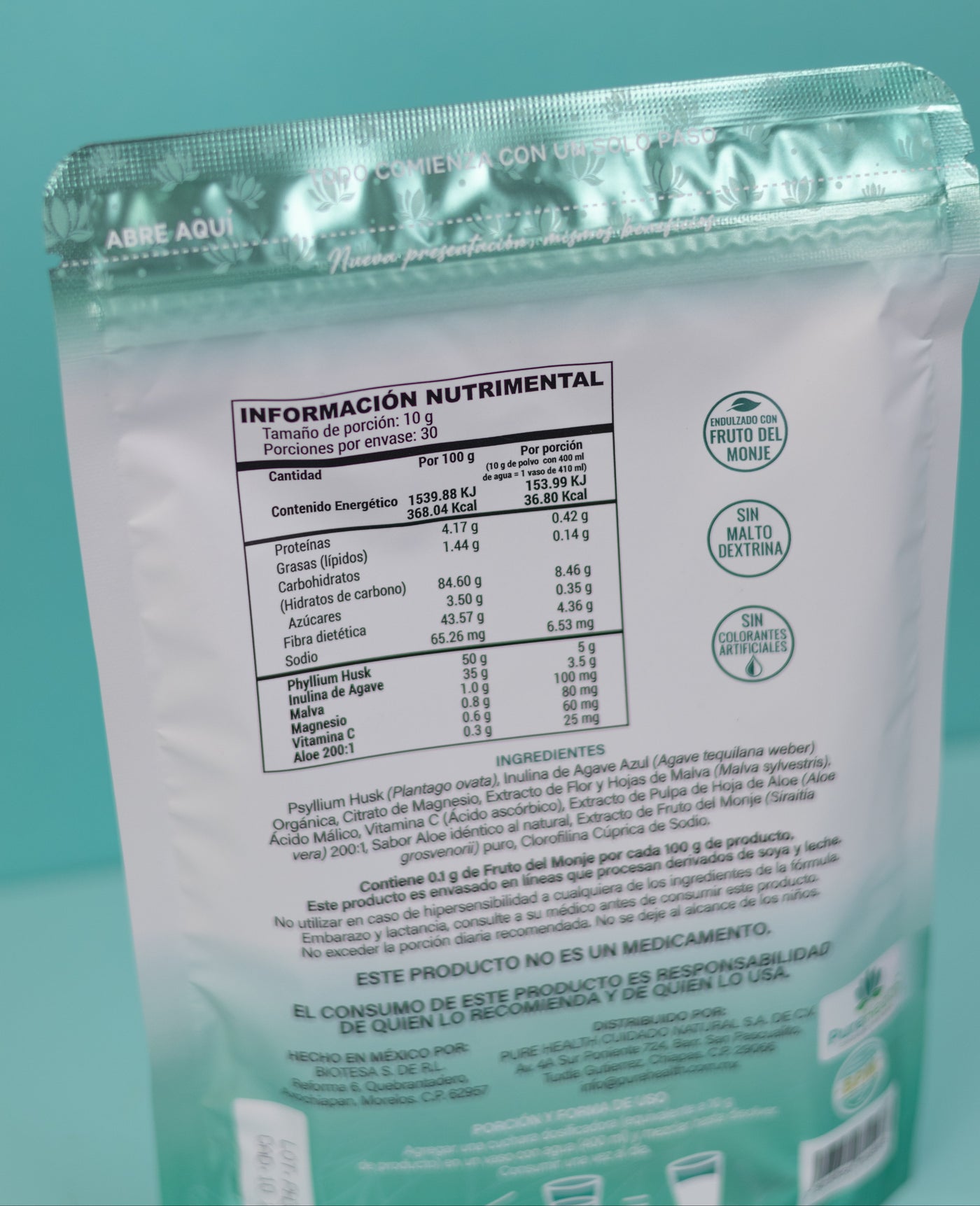 Fibra soluble que, al mezclarse con agua, forma un gel natural que ayuda a restaurar y regular el tránsito intestinal de manera suave.