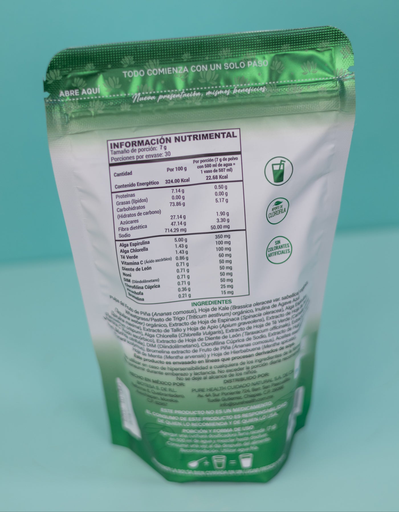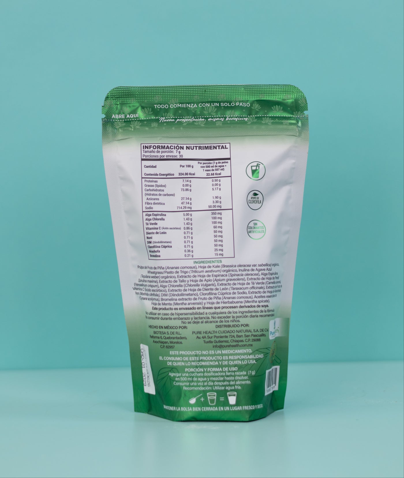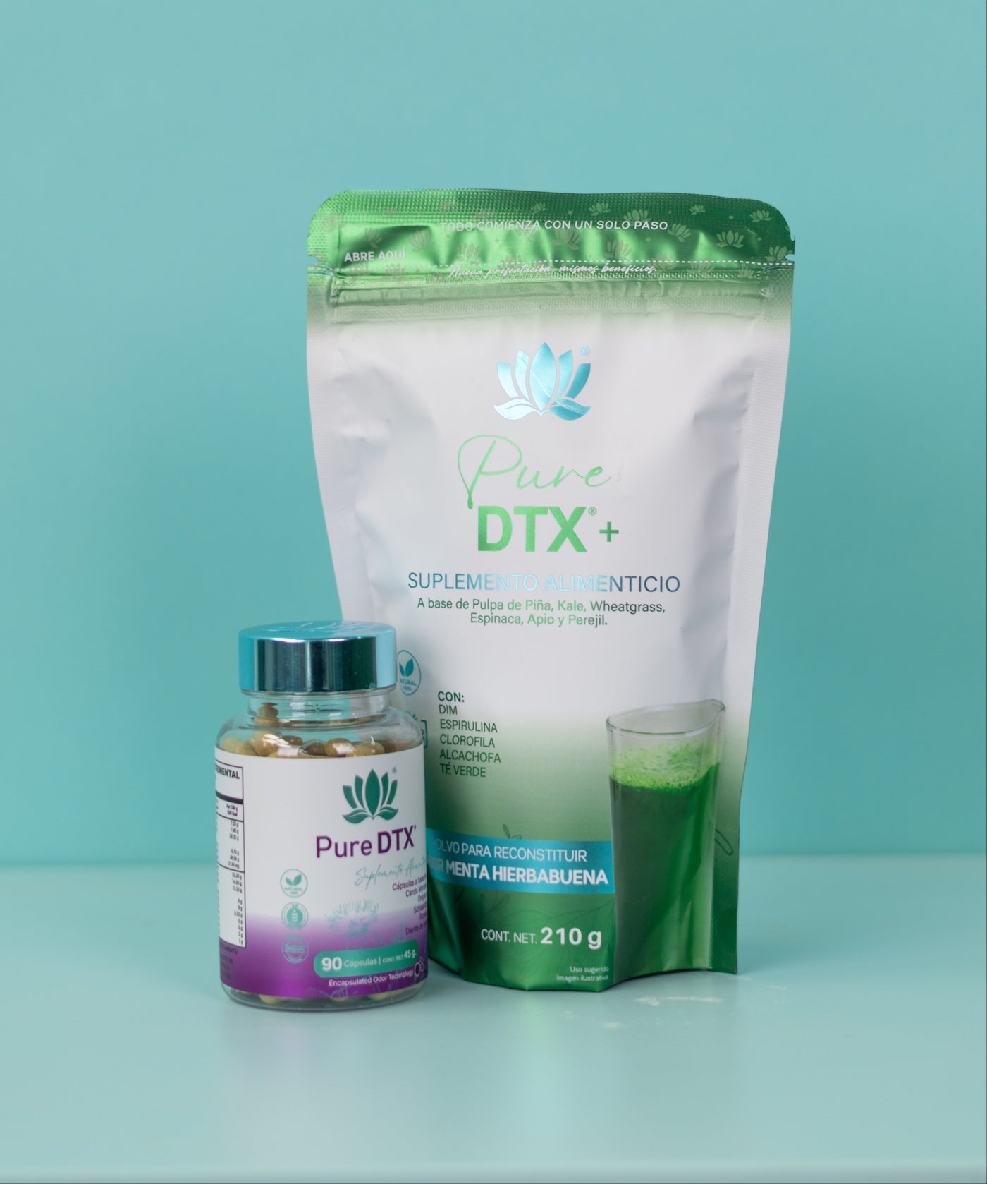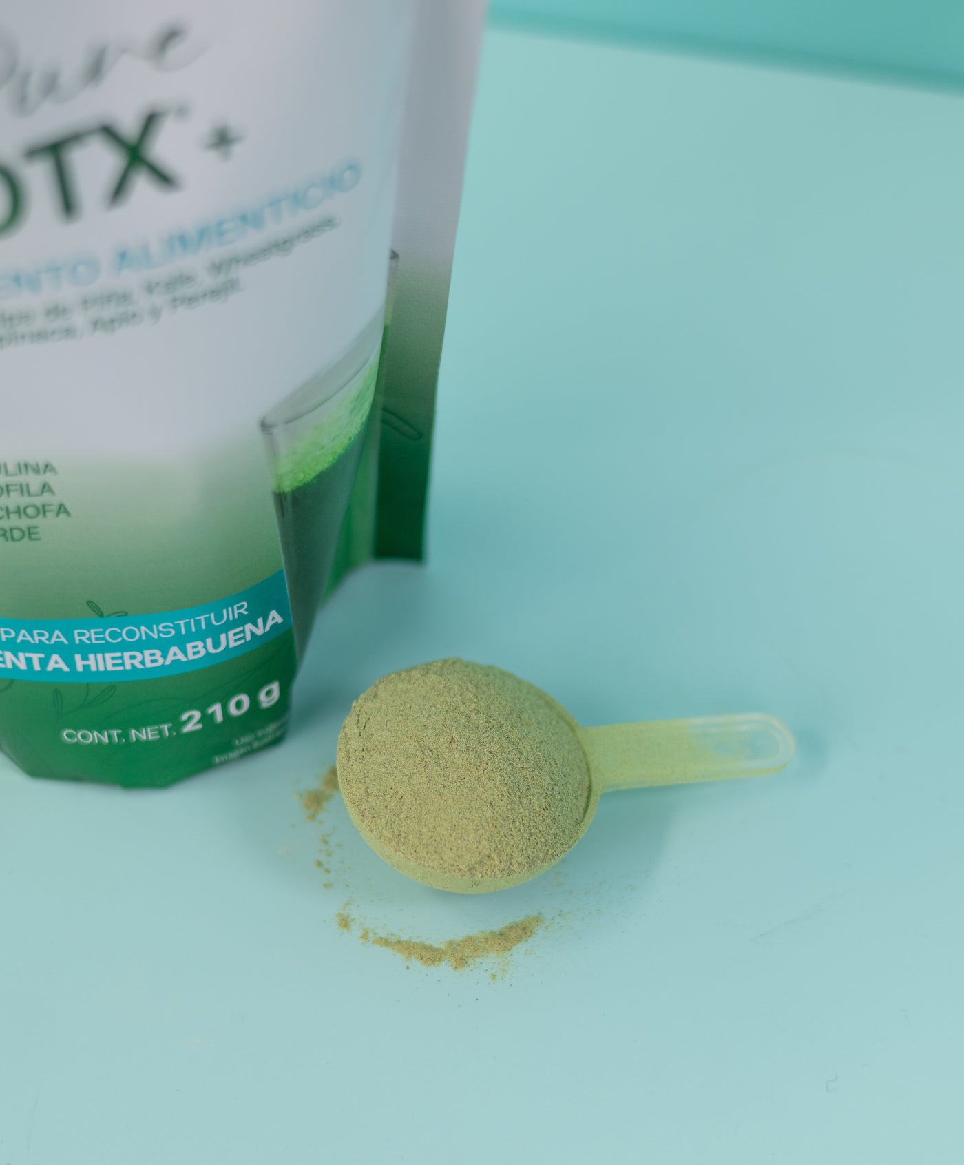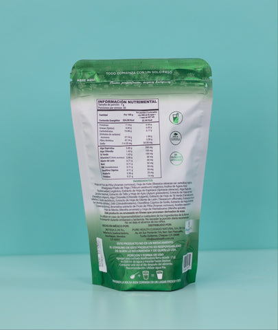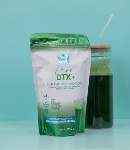 D-TX Polvo: Piña, Naranja, Té Matcha, Alga Espirulina, Perejil, Apio, Alga Chlorella, Clorofilina Cúprica, Aceite Esencial de Menta y Hierbabuena.